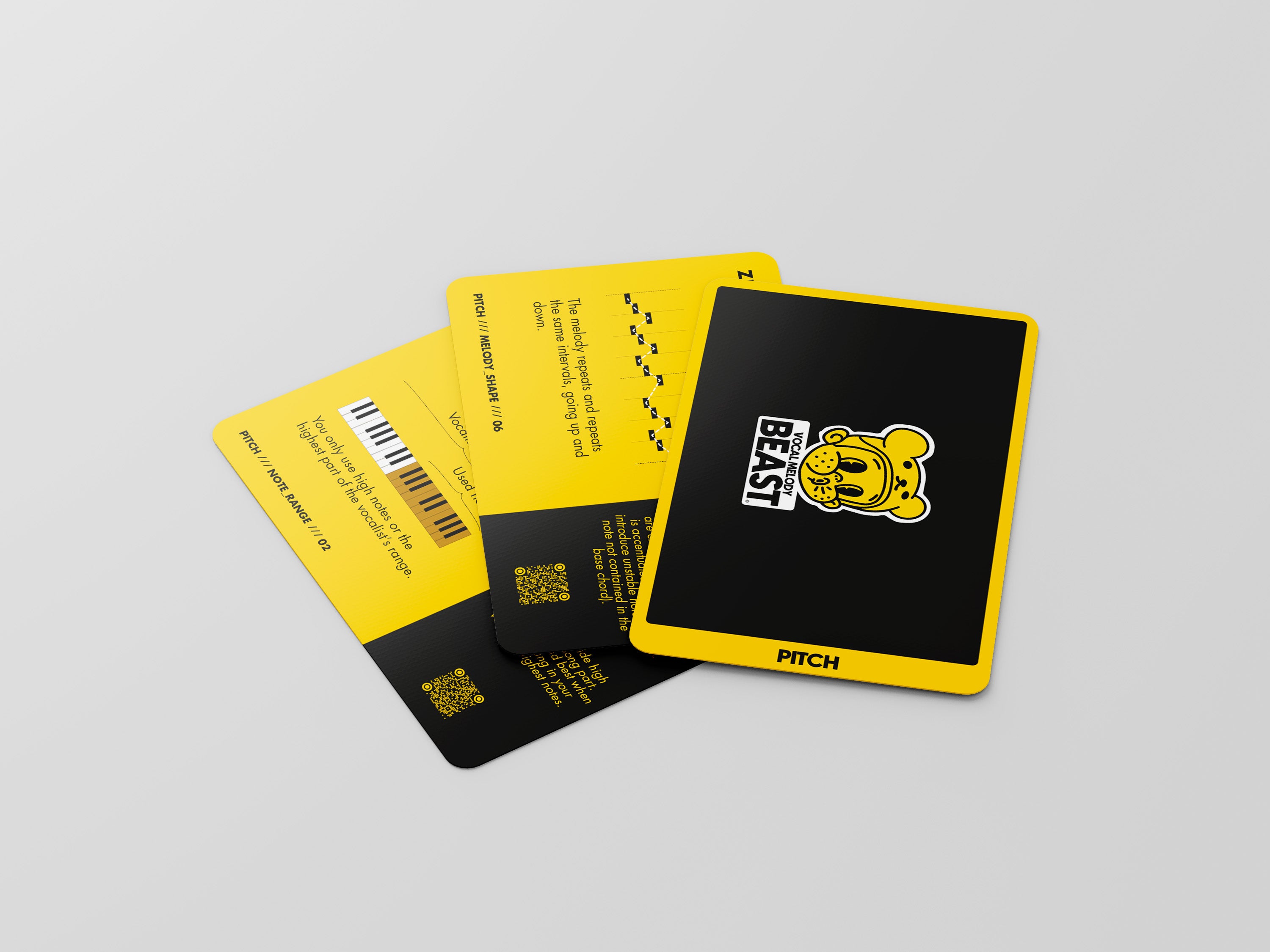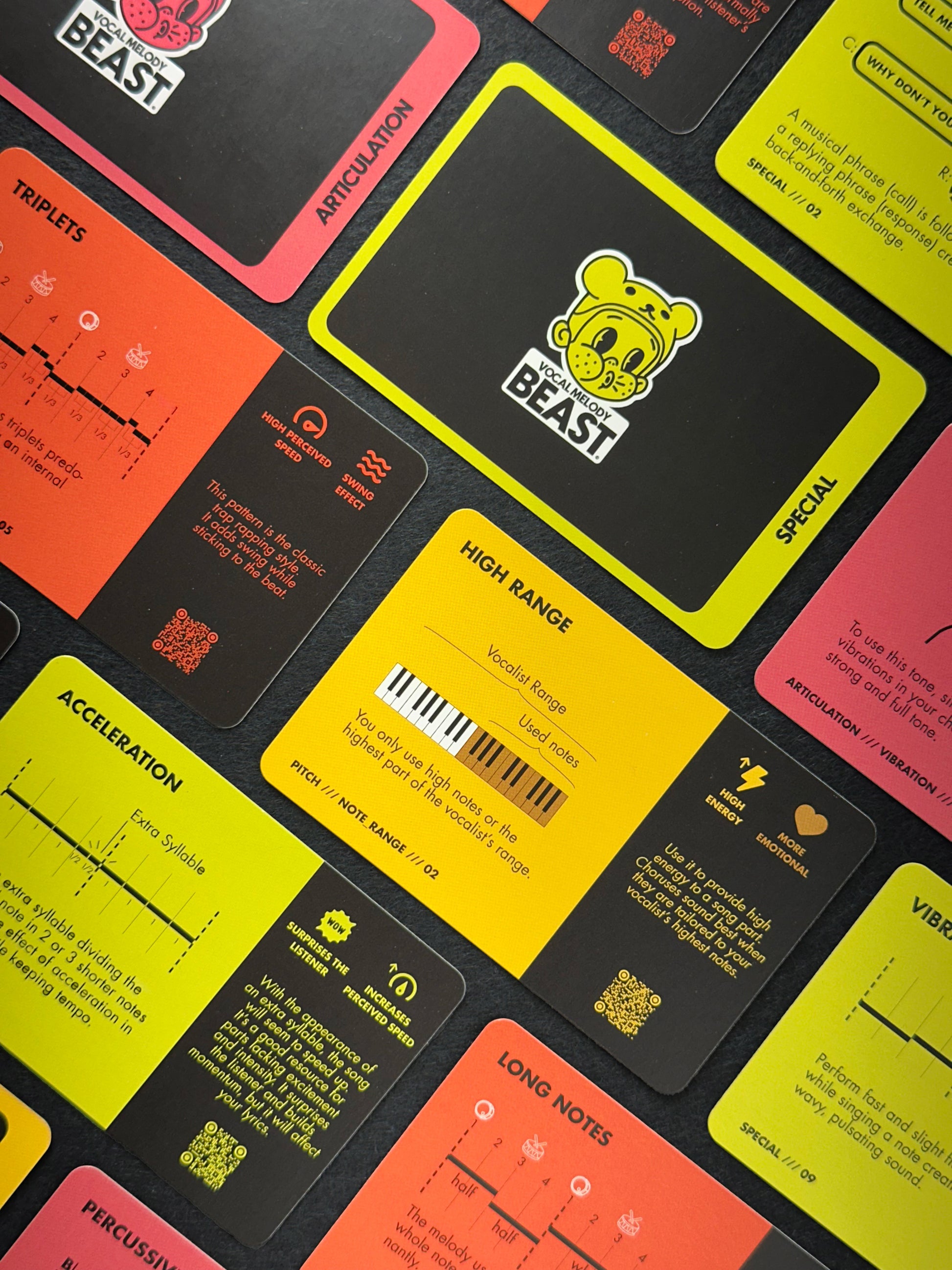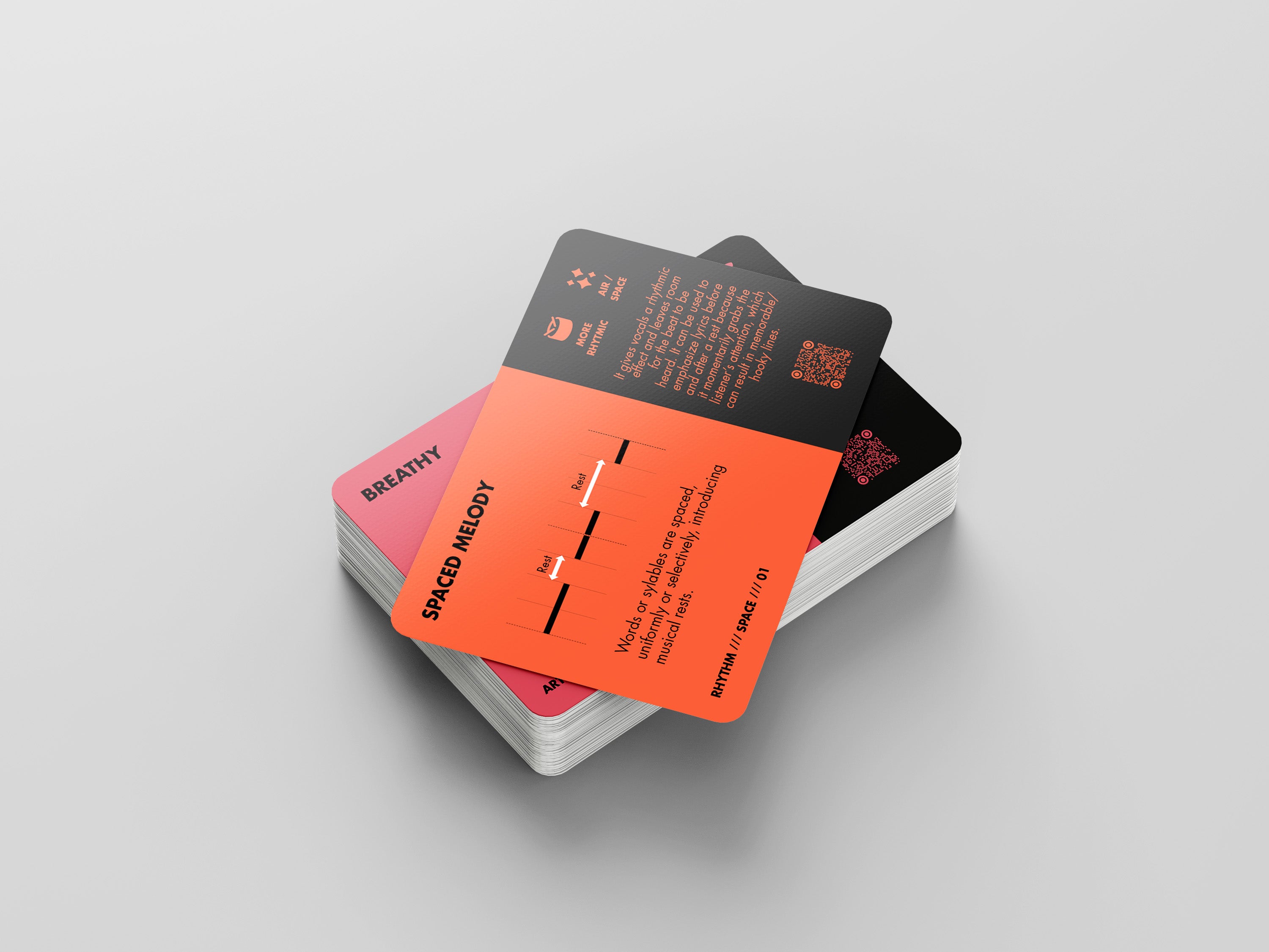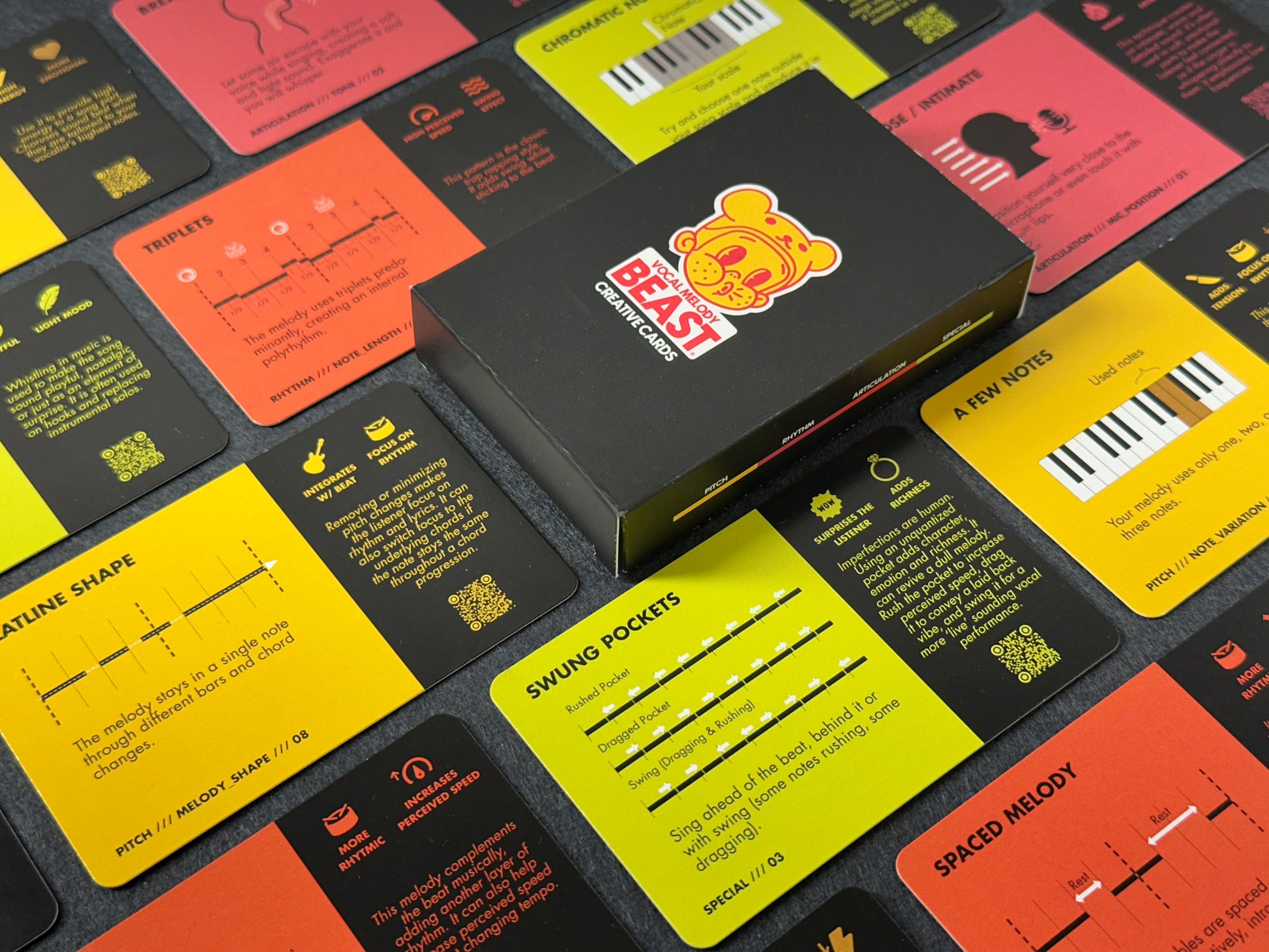 48 full colored cards with proven cues to expand your vocal melodic creation, +2 instruction cards. Includes expanded content with examples, accessible through QR scans.